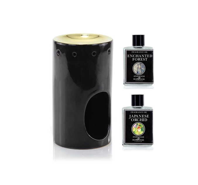 Perfect for use with our Fragrance Oils, this black, tower-shaped ceramic Oil Burner is designed in a sleek, minimalist style accented with gold. This set comes with Enchanted Forest & Japanese Orchid fragrance oils.