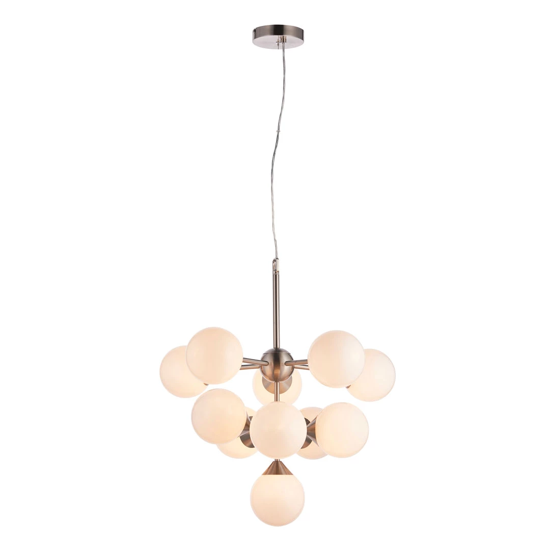 A timeless yet modern design with a mid-century feel. This impressive pendant is at home in modern or classic interiors. Finished in a brushed nikel finish with gloss white glass shades and suspended from height adjustable thin wire cable with clear flex.