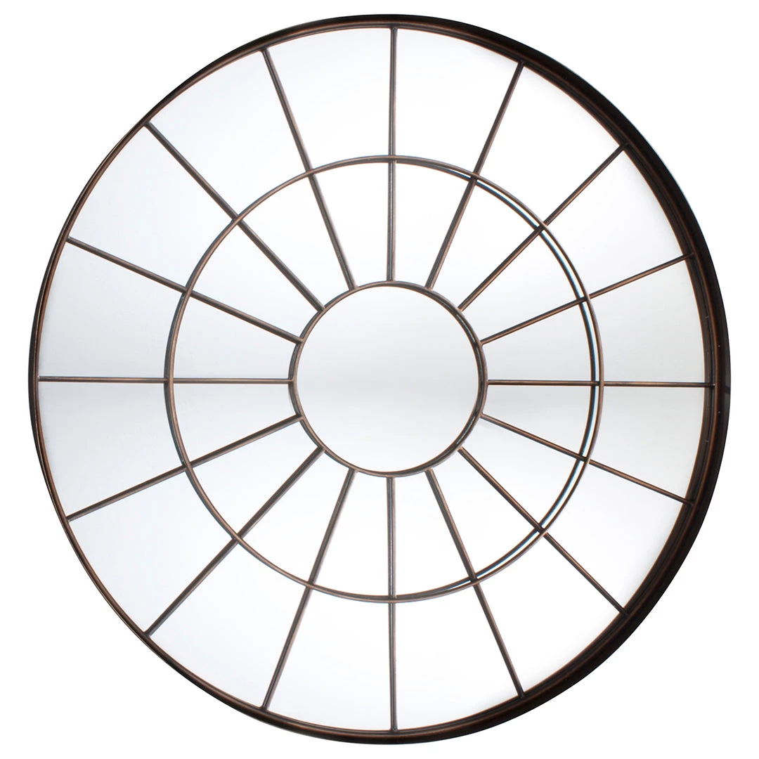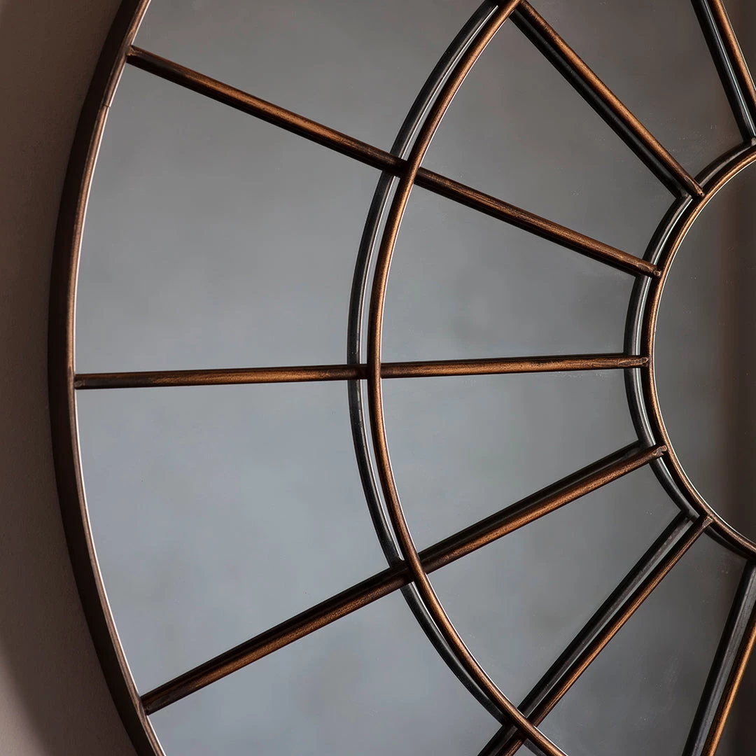 Large round chic industrial window mirror with a bronzed effect metal frame.