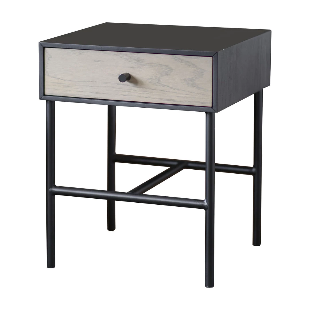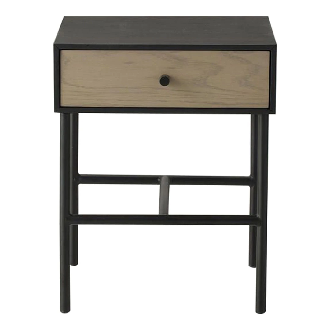 Featuring a black Oak veneer body and white Oak veneer drawers and shelves, this collection is finished with black metal legs and handles.