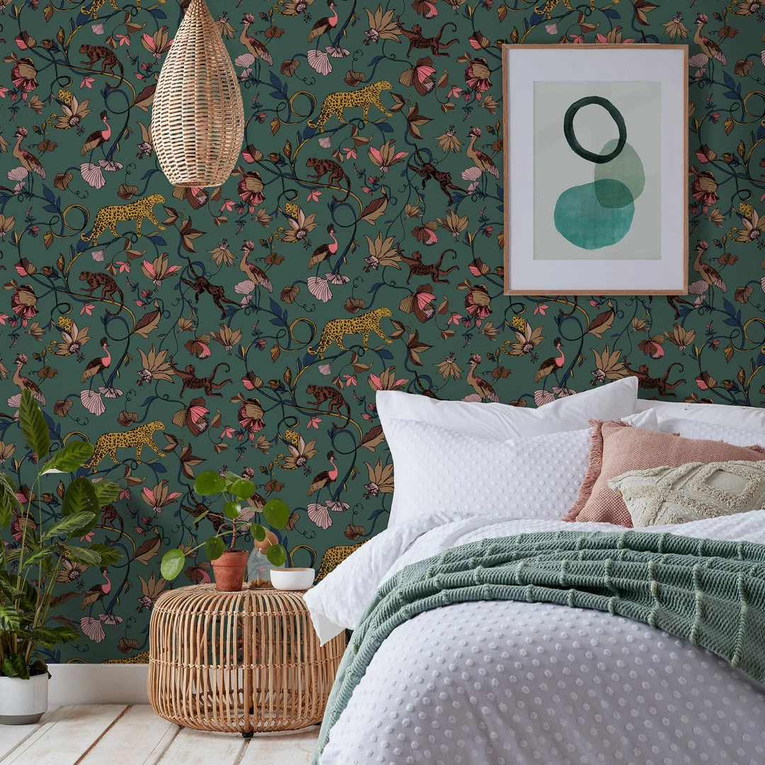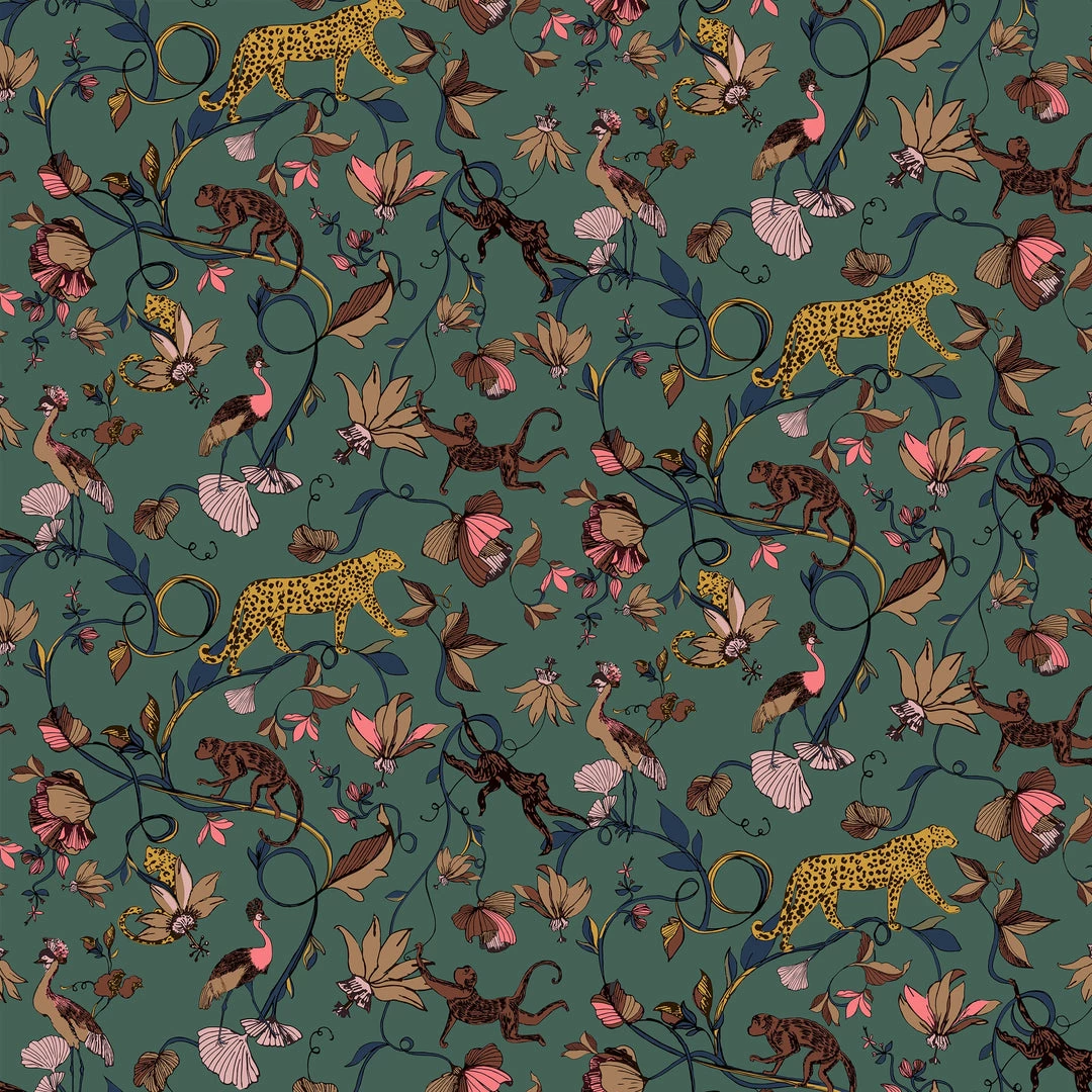 This pattern Features a floral pattern mixed with stunning animal drawings such as a monkey and leopard on a beautiful juniper green background