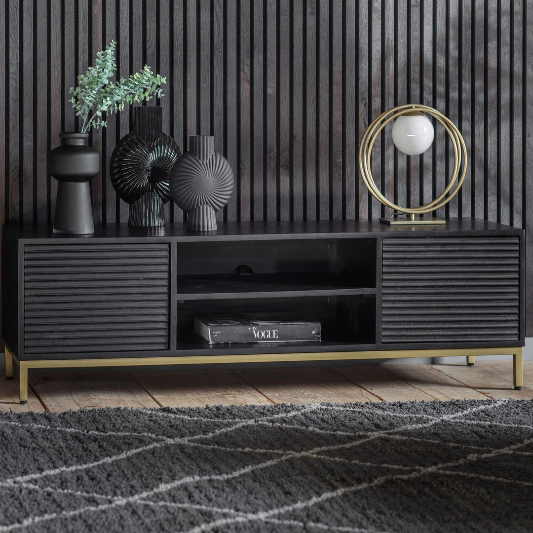 The Roton Media unit offers an eye-catching piece, which can be used on its own or paired with other pieces from the range. The black mango wood, with its routing on the drawer fronts which creates a ripple effect that catches the light, is combined with a gold-finish metal base for a sophisticated apartment living look.