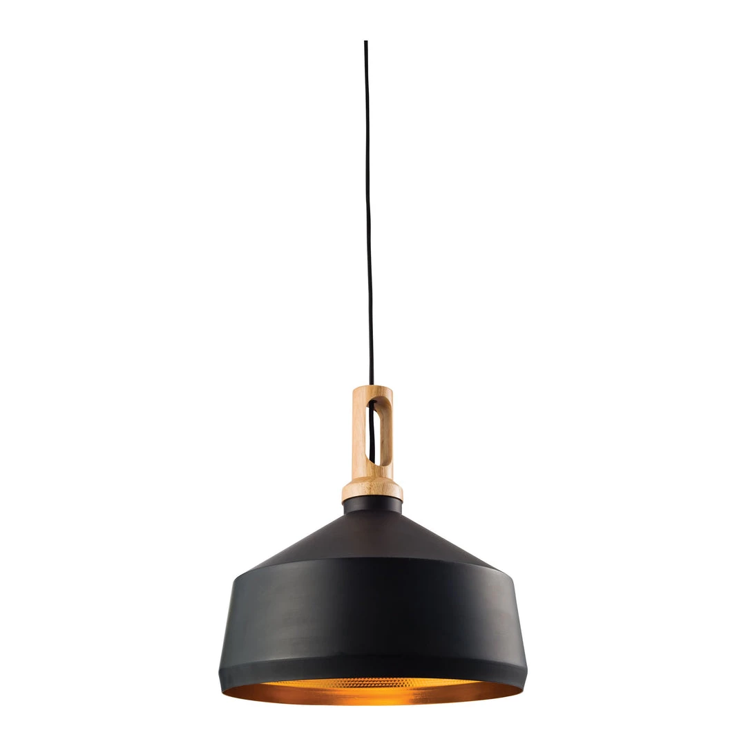 Stunning modern ceiling pendant finished in matt black to the exterior with a gold hammered effect to the inner and complimented by a natural wood trim.