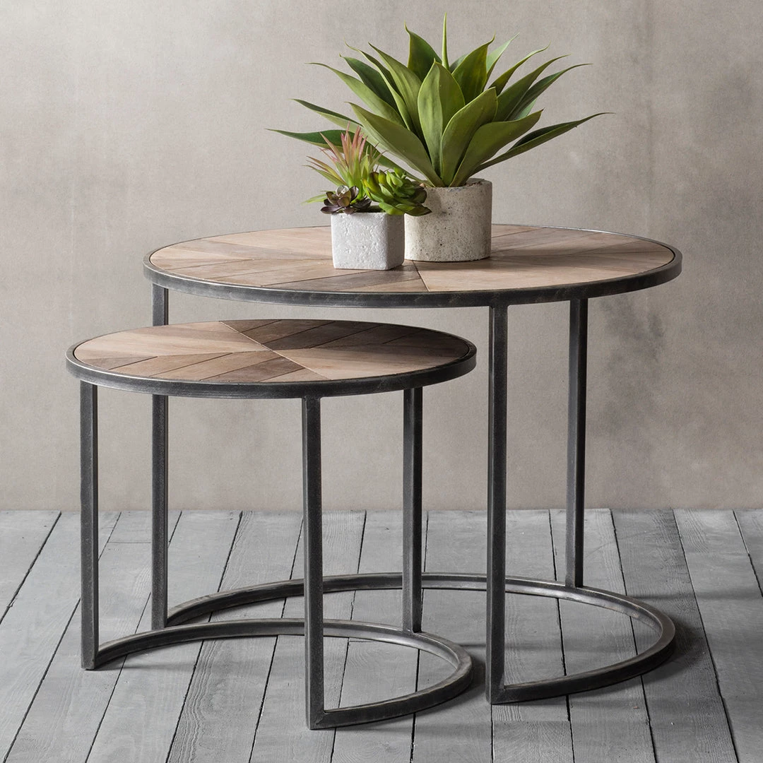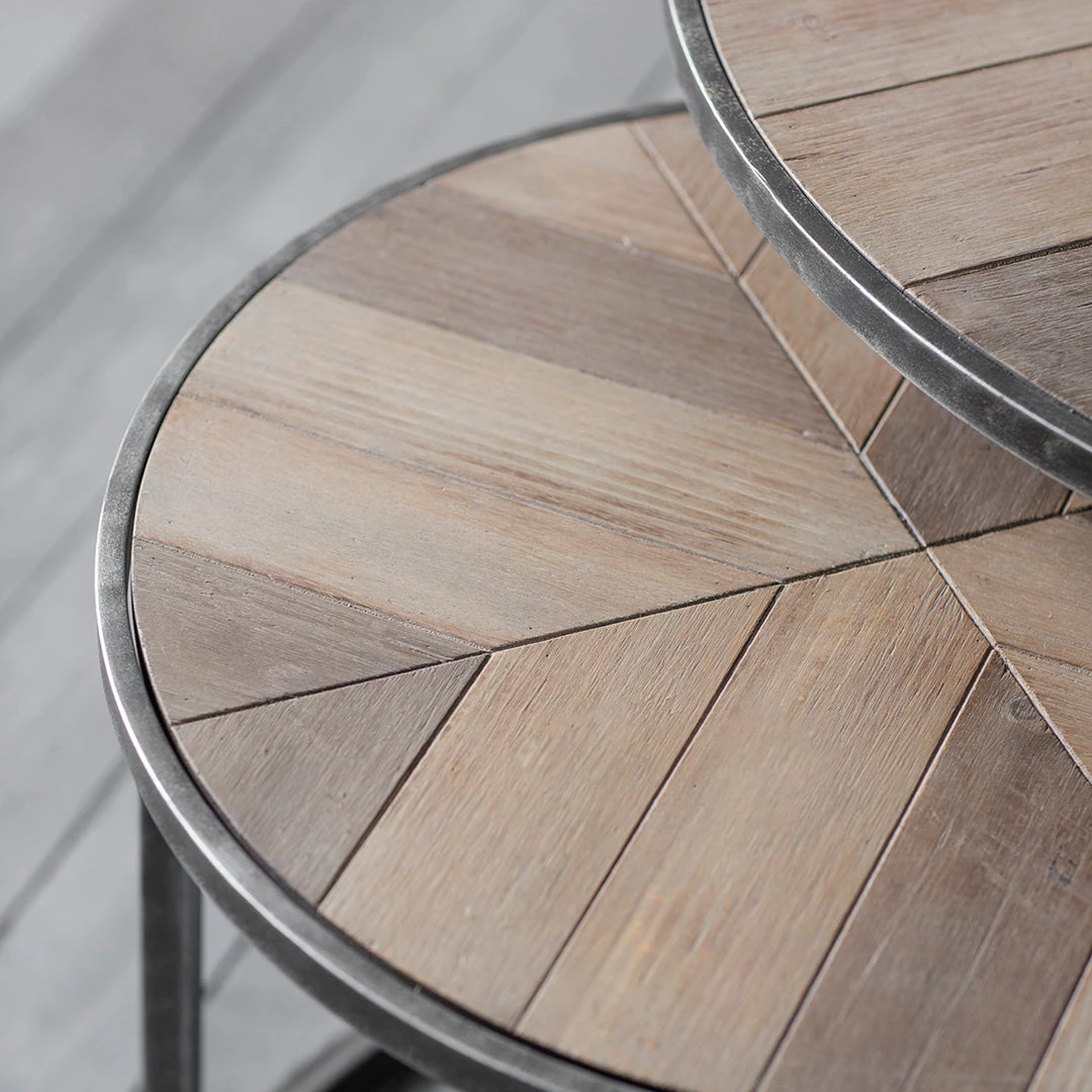 This stylish nest of 2 tables features a chevron effect weathered timber inlaid top and gun-metal metallic base that suits any interior with nod towards industrial and eclectic design.