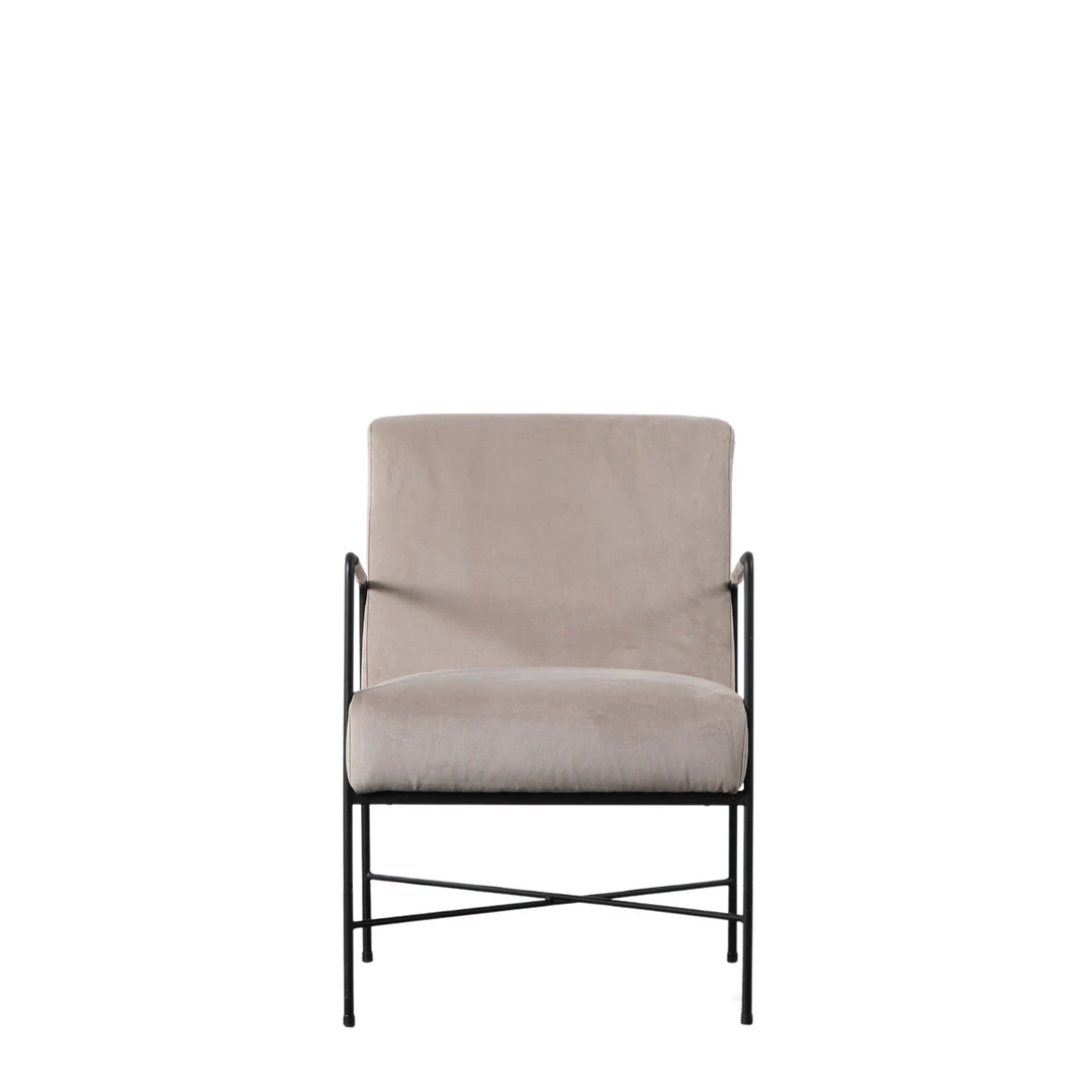 This modern every day armchair with a black metal frame paired with an upholstered seat and back is a perfect addition to a Livingroom or any cosy corner. With the narrow metal arms featuring fabric wrapped detail, it is perfect for apartment living or other smaller spaces.