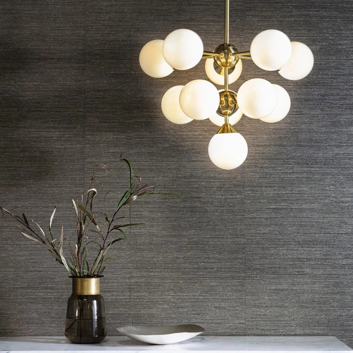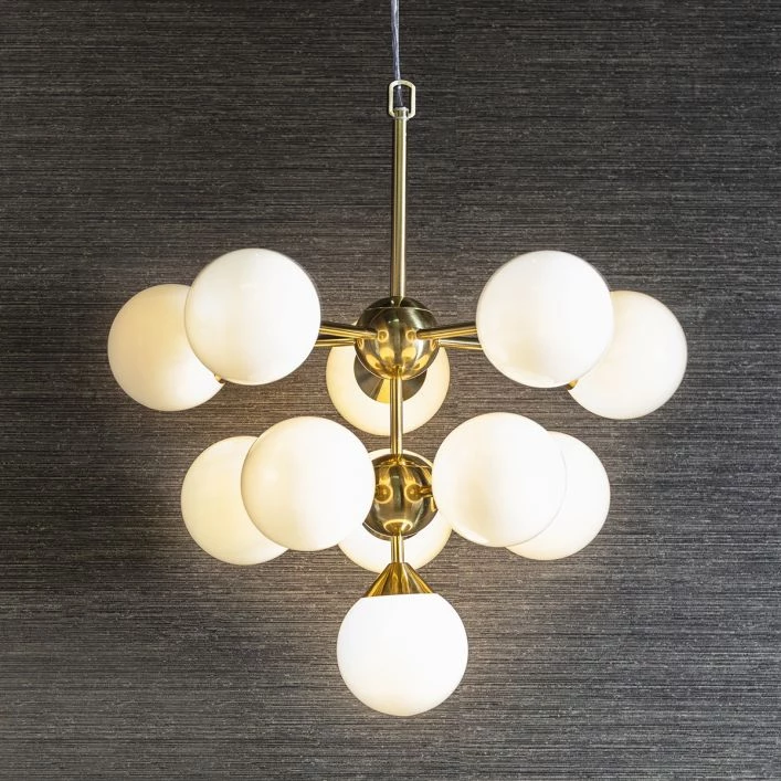 A timeless yet modern design with a mid-century feel. This impressive pendant is at home in modern or classic interiors. Finished in a brushed brass finish with gloss white glass shades and suspended from height adjustable thin wire cable with clear flex.