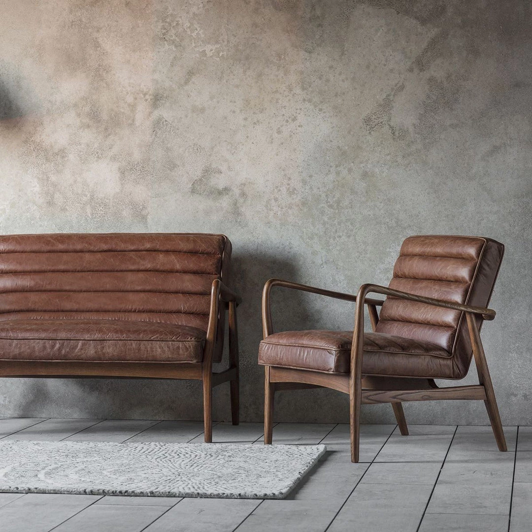 Stylish & contemporary mid-century 2 seater sofa in distressed brown top grade leather depicting natural textures and grains, decorative horizontal channel stitched detailing and a solid oak angled frame.