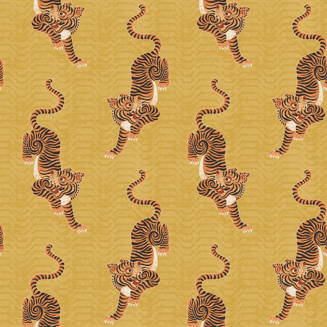 This pattern Features a Tibetan Tiger in traditional drawn form on a mustard yellow background. Perfect for a feature wall.
