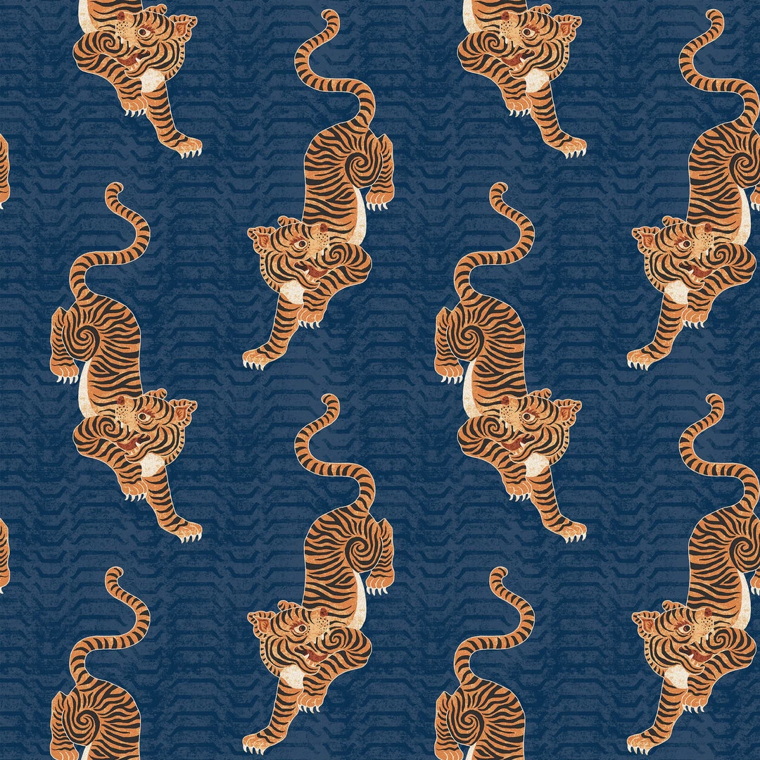 This pattern Features a Tibetan Tiger in traditional drawn form on a navy blue background. Perfect for a feature wall.