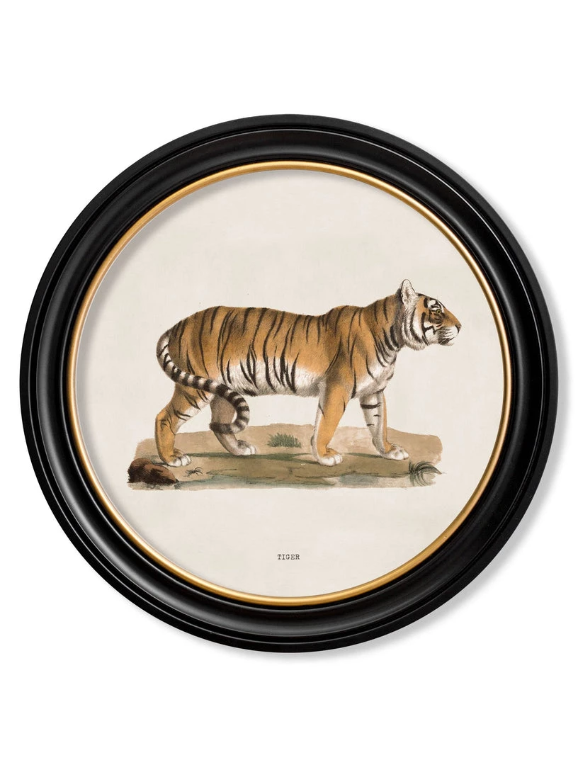 Referencing a beautiful French print from the first part of the 19th century, this striking tiger illustration has been digitally restored and enhanced to bring its vivid colour back to life. For maximum visual impact, it’s presented in an eye-catching round frame custom-made in the UK from sustainable wood and finished in house.