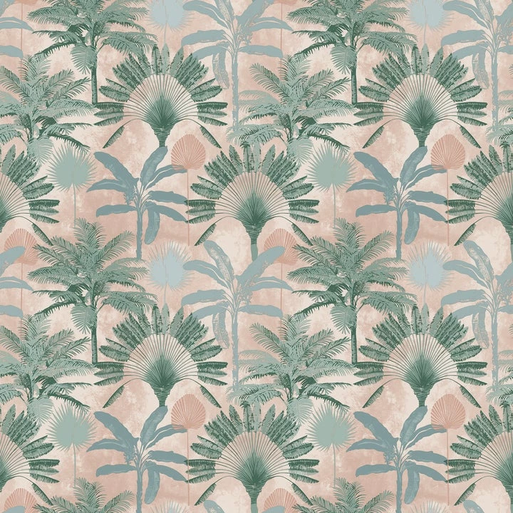 This pattern features a tropical leaf & tree designs with on a light blush backdrop. Stunning in any room.