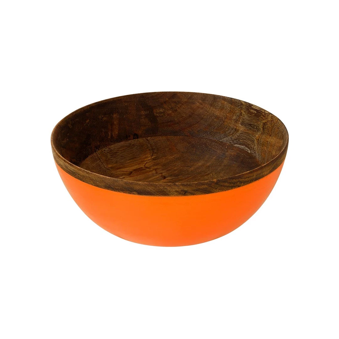 Bright orange mango wood serving bowl for crisps, salad, fruit or party food. This large wooden bowl has been handmade in India and makes for a colourful addition to your kitchen table décor.