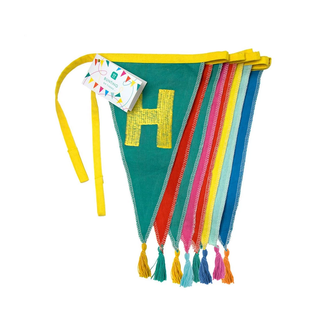 Multicoloured Happy Birthday Bunting with Tassels by Talking Tables. This reusable and washable fabric bunting is handmade from sustainably sourced 100% cotton. Suitable for indoor and outdoor use and perfect for adding a pop of colour to any adults or kids birthday party. Features 12 pennants in different rainbow colours and letters spelling out ‘Happy Birthday’. Simply hang on the wall, in the garden or across the ceiling to create a fun atmosphere your guests will love! Size: 3m (118in) with 12 pennants.