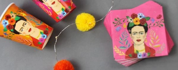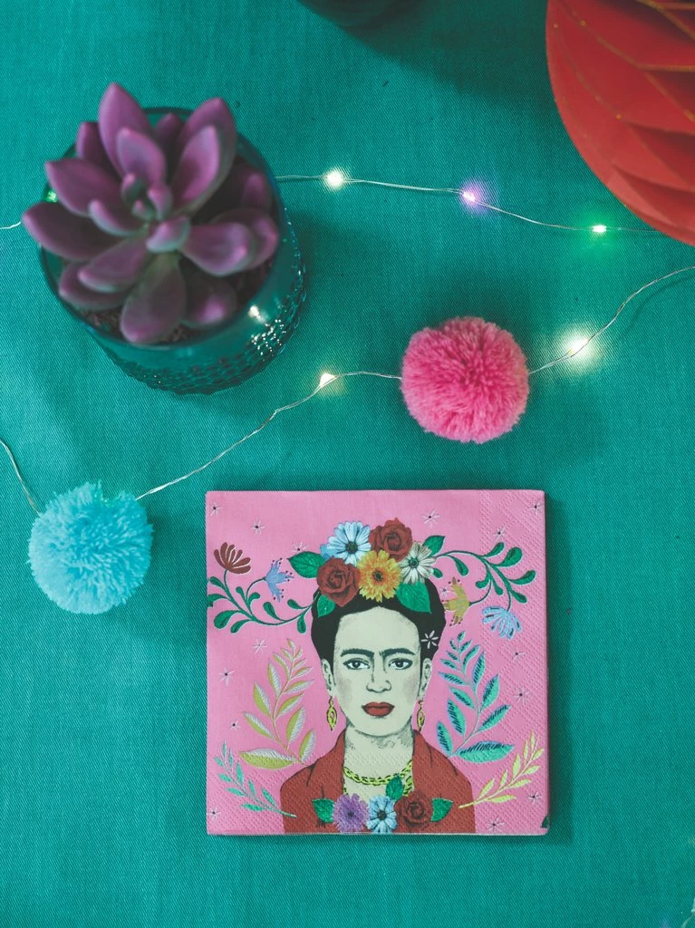 Bright pink Frida Kahlo paper cocktail napkins. Boho party napkins for Mexican fiesta, Cinco De Mayo, summer birthday party or colourful paper napkins for decoupage. The perfect disposable tableware to pair with our Frida Kahlo party decorations and gifts.